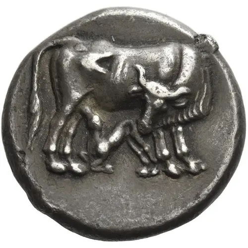 | Obverse description | Cow standing right, head lowered left, suckling calf. |