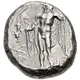 Reverse description Bearded Dionysos, nude but for drapery hanging from arms, standing left, holding kantharos and thyrsos; monogram to lower left.