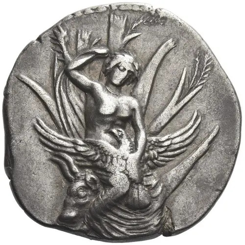 | Beschrijving voorzijde | Europa, semi-nude, seated facing in plane tree, raising her veil with her right hand and, with her left, holding eagle with spread wings in her lap |