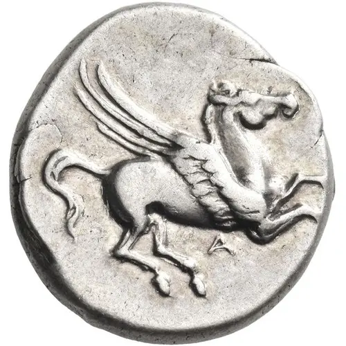 | Obverse description | Pegasos flying right with straight wings; below, A. |