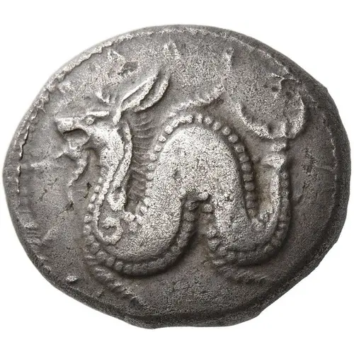 | Reverse description | Bearded sea-serpent swimming left, all within a dotted square border within an incuse square. |
