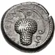 Reverse description Grape bunch on vine; Θ to right of stem, ΣOΛEΩN to left, ankh-like symbol to lower right; all within dotted circle.