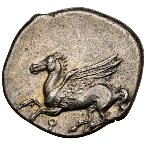 | Reverse description | Head of Athena right, wearing Corinthian helmet pushed back on head; N below bowl, bearded herm facing behind. |