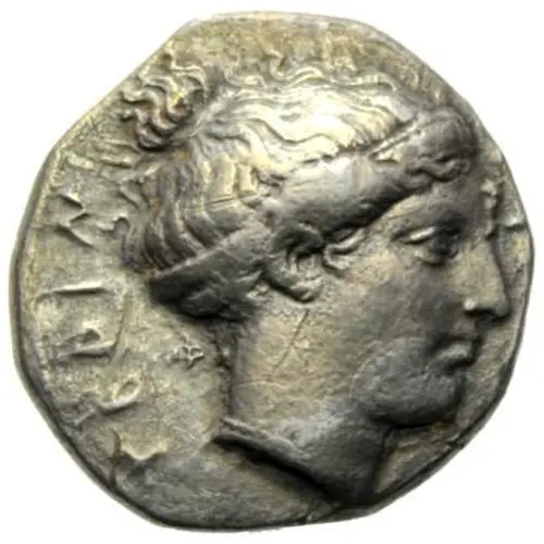 | 表面の説明 | Head of the nymph Terina to right, wearing pearl necklace, and with her hair rolled up and bound at the top of her head; behind her neck, tiny Φ. |