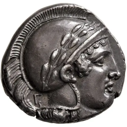 | Description de l’avers | Head of Athena to right, wearing crested and laureate Attic helmet; behind neck guard, Γ. |