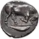| Description du revers | Bull butting right; between hind legs, Λ; in exergue, fish to right. |