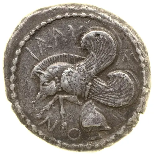 | Descripción del anverso | Forepart of a winged boar left; helmet below; dotted border. |