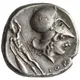 | Reverse description | Head of Athena facing right, wearing a Corinthian helmet. Behind her, a nude male wearing pilos and holding a staff, standing facing in front and resting his right hand on a shield. Inscription on the bottom right. |