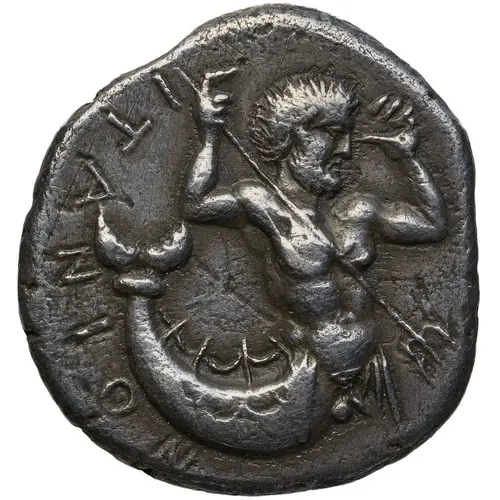 | 正面描述 | Bearded sea-god right, spearing downwards with trident held in his raised right hand. |