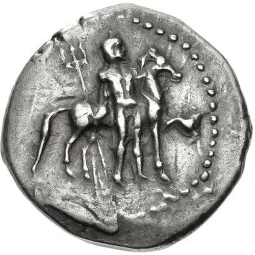 | Descrizione del dritto | Poseidon, nude but for his wreath, standing right, holding a trident in his right hand and the reins of his horse, standing right behind him. |