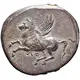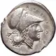 Reverse description Head of Athena right, wearing Corinthian helmet with neck-guard, behind thunderbolt.