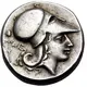 | Opis rewersu | Head of Athena to right, wearing Corinthian helmet with a neck flap; behind her neck, filleted thyrsos and Λ. |