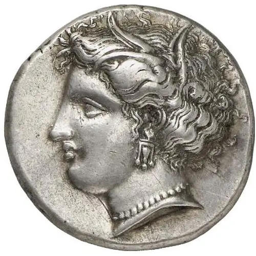 | Obverse description | Head of Persephone to left, wearing wreath of grain leaves, triple-pendant earring and necklace |