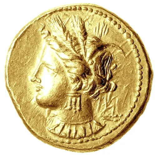 Obverse description Head of Tanit left, wreathed with corn, wearing necklace and triple-drop ear-ring