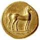 Reverse description Horse standing right; three pellets in triangular arrangement at horse`s feet; in exergue, eye on the left and goat`s head on the right.
