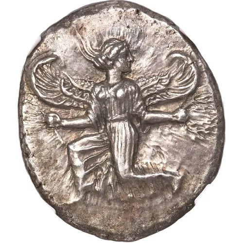 | Description de l’avers | Winged female goddess (Iris) in kneeling-running stance left, head facing right, holding wreath outward in left hand and kerykeion in right. |