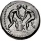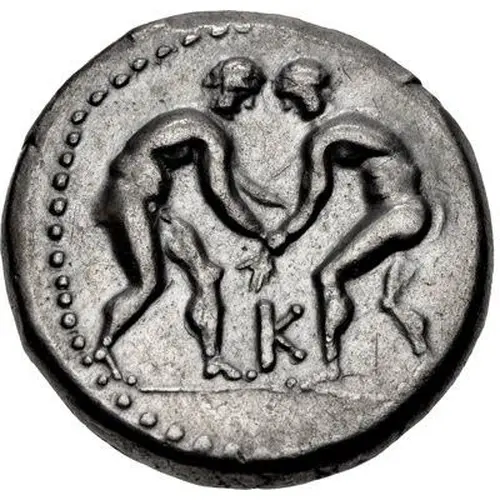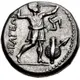 Reverse description Slinger in throwing stance right; to right, triskeles above greave, shield, and spearhead.