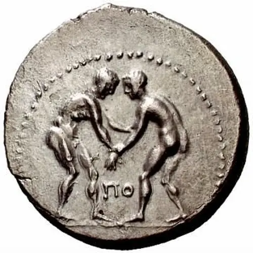 | 背面描述 | Slinger in throwing stance right; to right, forepart of horse right above monogram; all within dotted square border. |