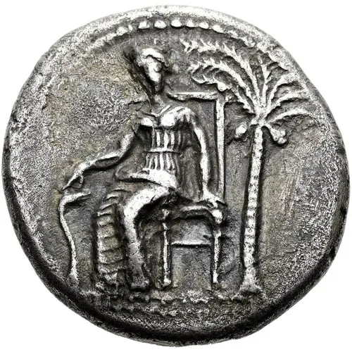 | توضیحات روی سکه | Female deity (Demeter or Persephone?) seated left on throne, head facing, placing her right hand on a serpent rising erect in front of her; behind to right, palm tree. |