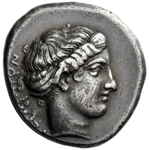 | Obverse description | Head of nymph Terina right, wearing sphendone. |