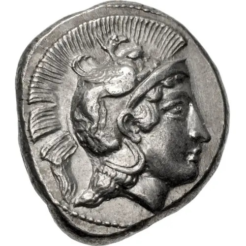 | 正面描述 | Head of Athena right, wearing crested Attic helmet decorated with a griffin on the bowl. |
