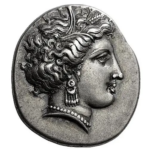 | Obverse description | Head of Demeter to right, wearing grain wreath, elaborate disc and crescent earring with pendants, and pearl necklace |