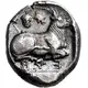 | توضیحات پشت سکه | Cow recumbent to right; above, grape bunch on vine with two leaves; all within incuse square. |