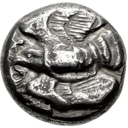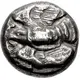 | Descrizione del rovescio | Vertical thunderbolt with wings above and volutes below, A F flanking and all within incuse circle |