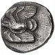 | Reversbeschreibung | Nike running to left, wearing a diadem and a chiton and with open wings, holding a wreath in her outstretched right hand and holding the hem of her chiton with her left and all within a circular incuse |