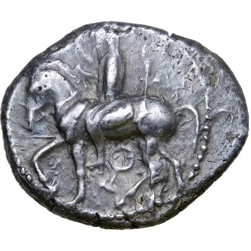 | Obverse description | Horseman (Syennesis?) riding to left, holding lotus flower in right hand and reins in left, bow in bowcase on saddle. Key symbol below horse |