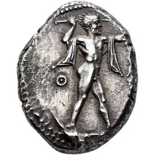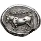 | Descrição do reverso | Bull standing left, retrograde ΠΟΜΕΣΔΑΝ above and all within circular incuse. |