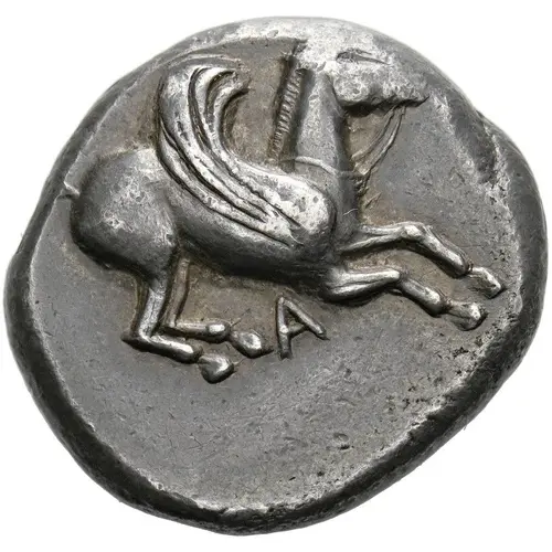 | Reverse description | Head of Athena right, wearing Corinthian helmet, single pendant earring and pearl necklace; behind, ivy branch with leaves. |