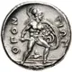 | Reverse description | Ajax, nude but for crested Corinthian helmet, holding sword in right hand, shield decorated with coiled serpent on left arm, advancing right on rocks; ivy leaf and broken spear below, OΠON-TIΩN around. |