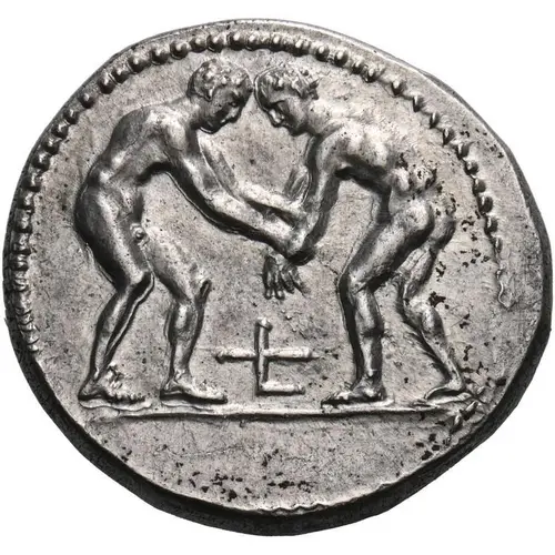 | Описание аверса | Two naked athletes, wrestling. |