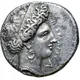 | Descripción del anverso | Head of Artemis Aptera to right, with hair elaborately curled upwards around a stephane ornamented with palmettes; she wears an elaborate crescent and solar-disk pendant earring with three drops and a pearl necklace; to right in smaller letters the artist`s signature. |
