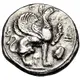 | Obverse description | Griffin with open jaws and his left foreleg raised, seated to right on ground line over an egg and dart frieze; to right, grain kernel. |