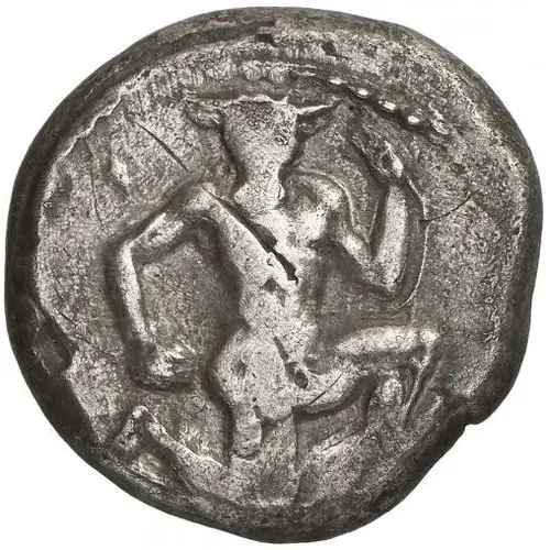 | Descrição do anverso | The Minotaur in a kneeling-running stance to right, its head facing. |