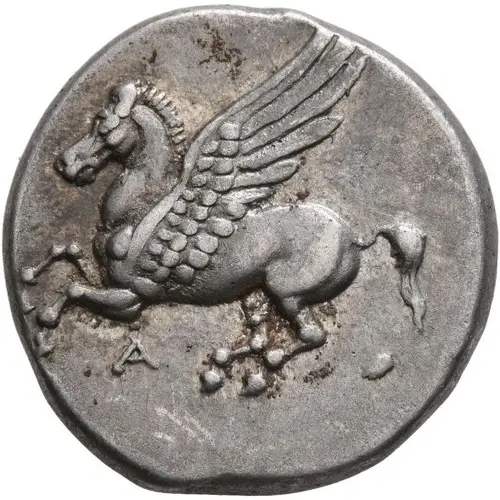 | Opis rewersu | Head of Athena to left, wearing Corinthian helmet; behind neck guard, ΔI and shield with strap; below, AP. |