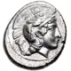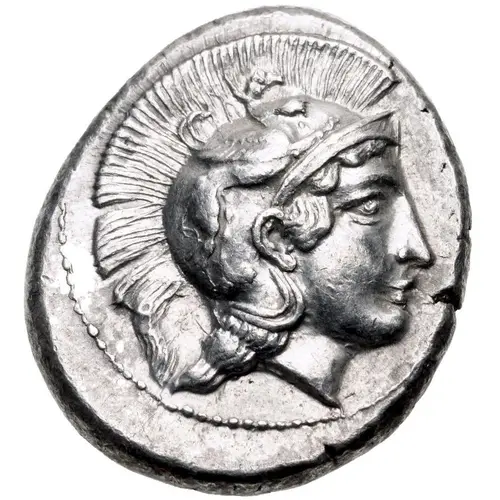 | Popis líce | Head of Athena right, wearing crested Attic helmet decorated with a griffin on the bowl. |