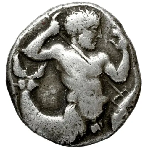 | Aversbeschreibung | Bearded sea-god right, spearing downwards fish with trident held in his raised right hand. |