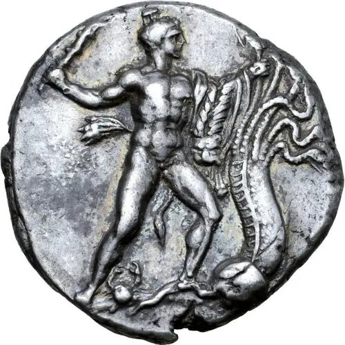 | Descripción del anverso | Herakles standing in fighting attitude to right, wearing Nemean lion skin, seizing with his left hand one of the heads of the Lernean Hydra, and with his right hand preparing to strike with club; by right foot, crab on exergual line. |