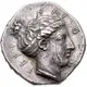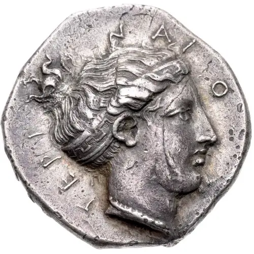 | Obverse description | Head of the nymph Terina right, hair in sphendone, decorated with crenellated geometric pattern, and tied into knot; tiny Π behind neck, TEPI-NAIO-N around. |