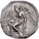 | Reverse description | Nike, wings spread, holding olive branch in right hand, and supporting herself with her left, seated left on stele decorated with a tiny Π. |