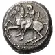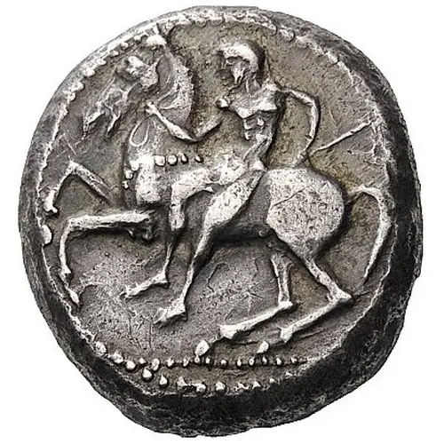 | Obverse description | Youthful nude rider holding the reins with his right hand and a goad in his left, seated sideways on horse prancing to left, preparing to jump off and run alongside the horse |