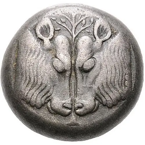 Description de l’avers Two calf’s heads confronted, forming a single facing head and between them, laurel tree