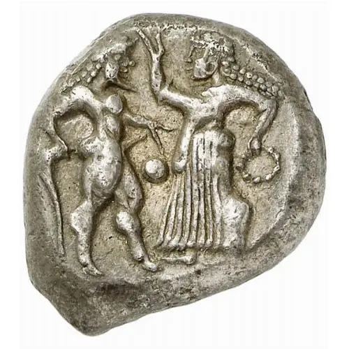 | Obverse description | On the left, nude, ithyphallic satyr walking left, holding his tail with his right hand and gesturing with his left toward a nymph, wearing long robes and walking to left, her left hand raised in greeting and holding a wreath in her right. Between them, large pellet |
