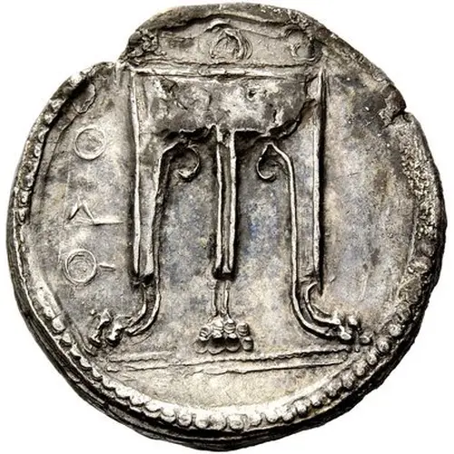 | Obverse description | Tripod with legs ending in lion’s feet, and with three handles and snakes rising from the bowl. Cable border |