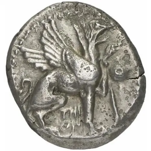 | توضیحات روی سکه | Griffin seated right, raising forepaw; club and apple to right. |