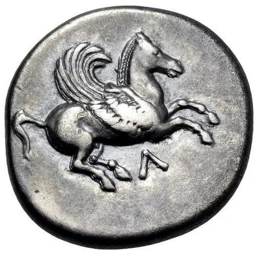 | Obverse description | Pegasus flying right with curved wing; below, Λ. |