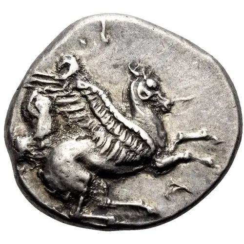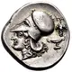 | Reverse description | Head of Athena to left, wearing Corinthian helmet with a neck flap; behind neck, grape bunch over kylix. |